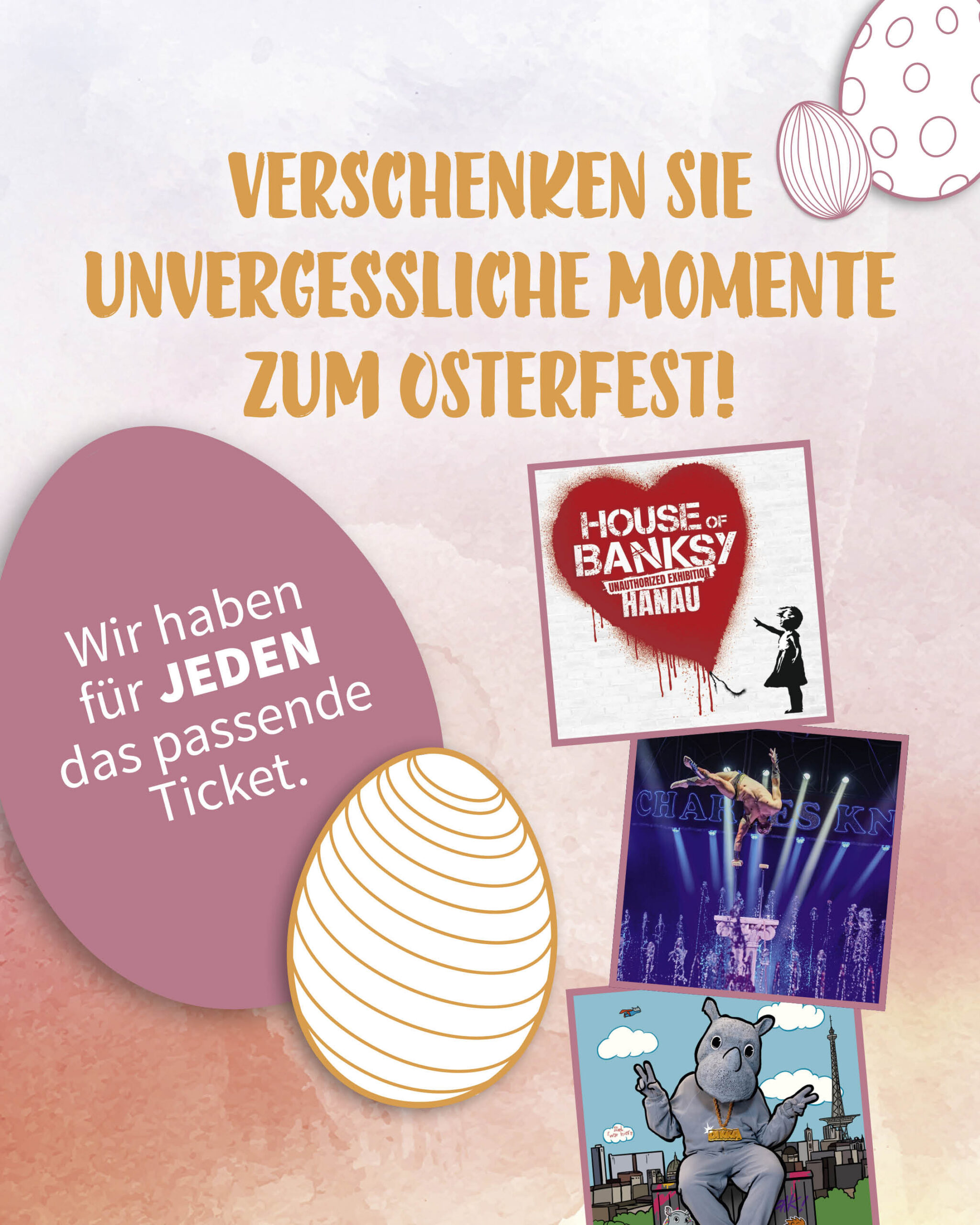 🐣🎫 Zu Ostern bereiten Event-Tickets Groß und Klein eine besondere Freude, die Herzen höherschlagen lassen 💓. Ob ein einzigartiger Abend zu zweit oder eine aufregende Zeit mit der ganzen Familie – diese Events versprechen unvergessliche Augenblicke ✨: